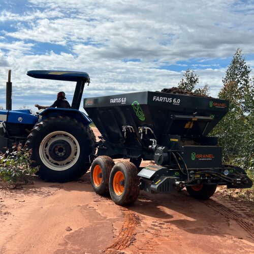 Distribuidor FARTUS 6.0 na adubação e distribuição em linha para correção de solo com calcário e compostos orgânicos em plantação de eucalipto.